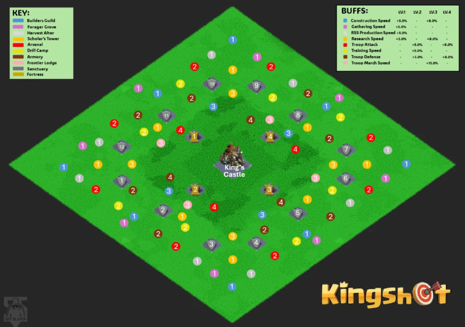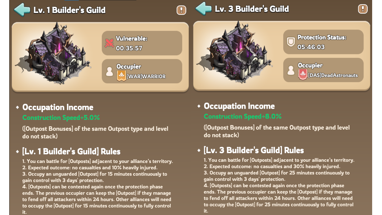 | Builder’s Guild | Lv. 1 | X138, Y138 | Construction Speed | +5% |