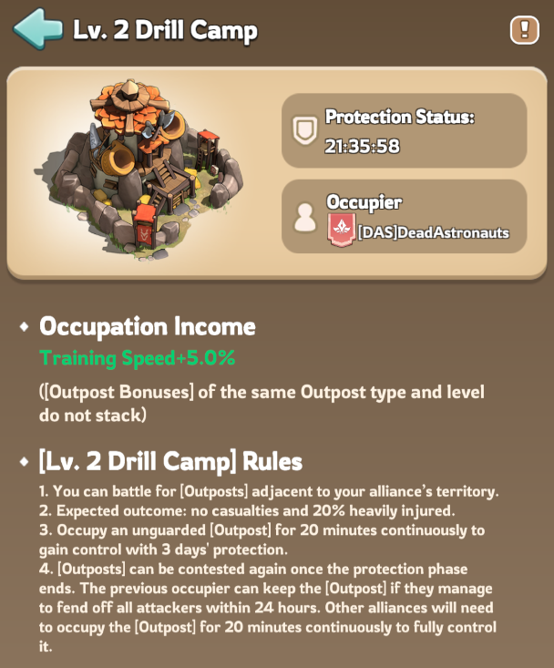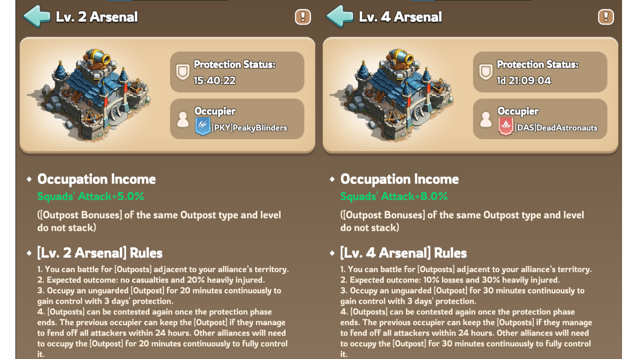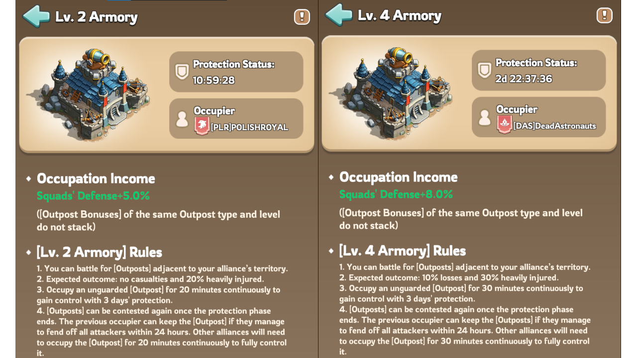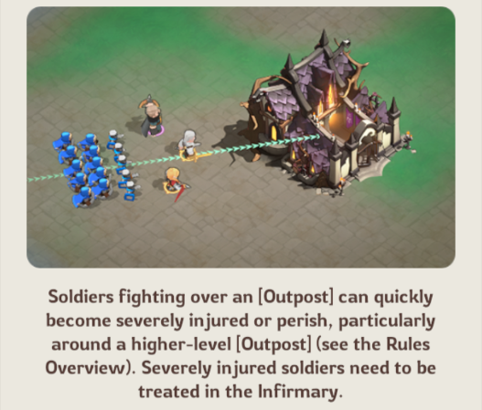 Higher level Outposts can cause significant troop losses during battles. Always scout the Outpost first to check enemy presence before joining the fight, and make sure your Infirmary has enough capacity to handle injured troops and prevent unnecessary losses