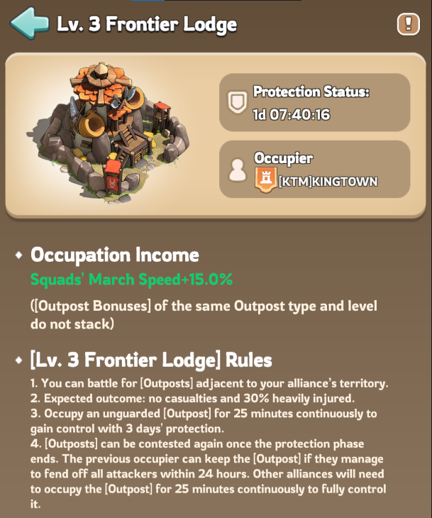 | Frontier Lodge | Lv. 3 | X768, Y327 | Squads March Speed | +15% |