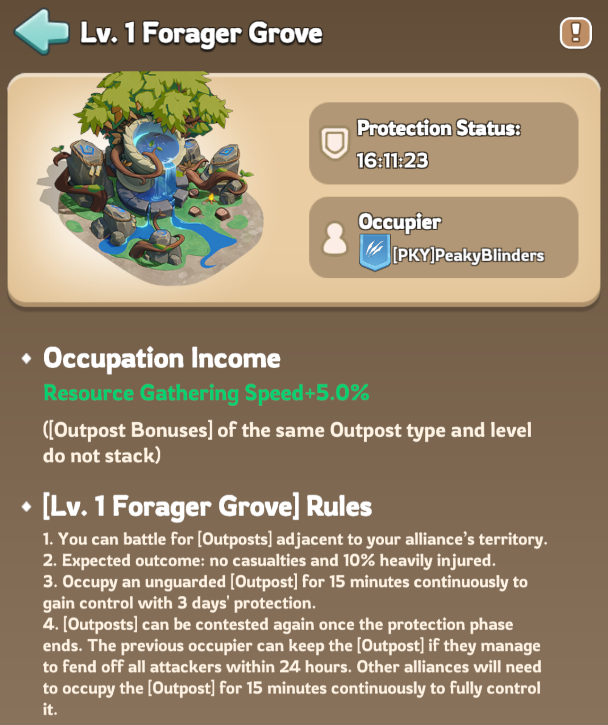 | Forager Grove | Lv. 1 | X1068, Y936 | Gathering Speed | +5% |