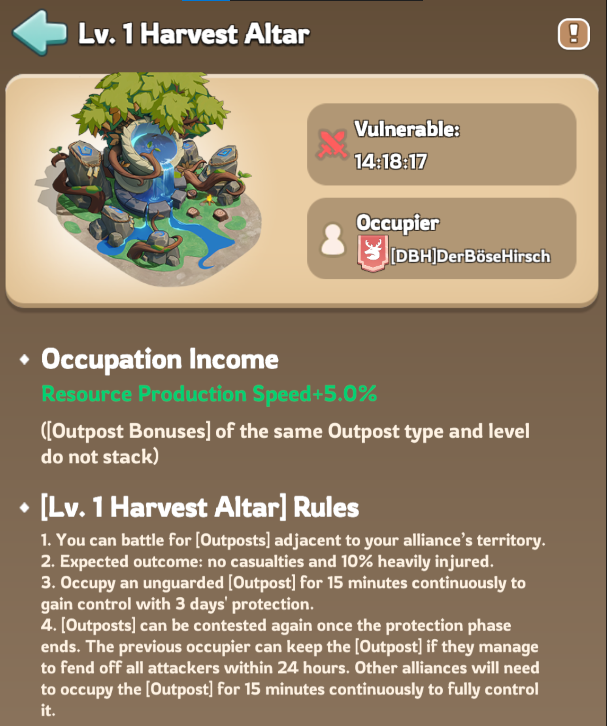 | Harvest Altar | Lv. 1 | X327, Y1038 | Resource Production | +5% |