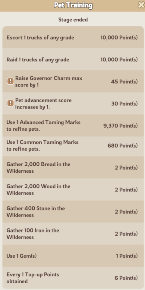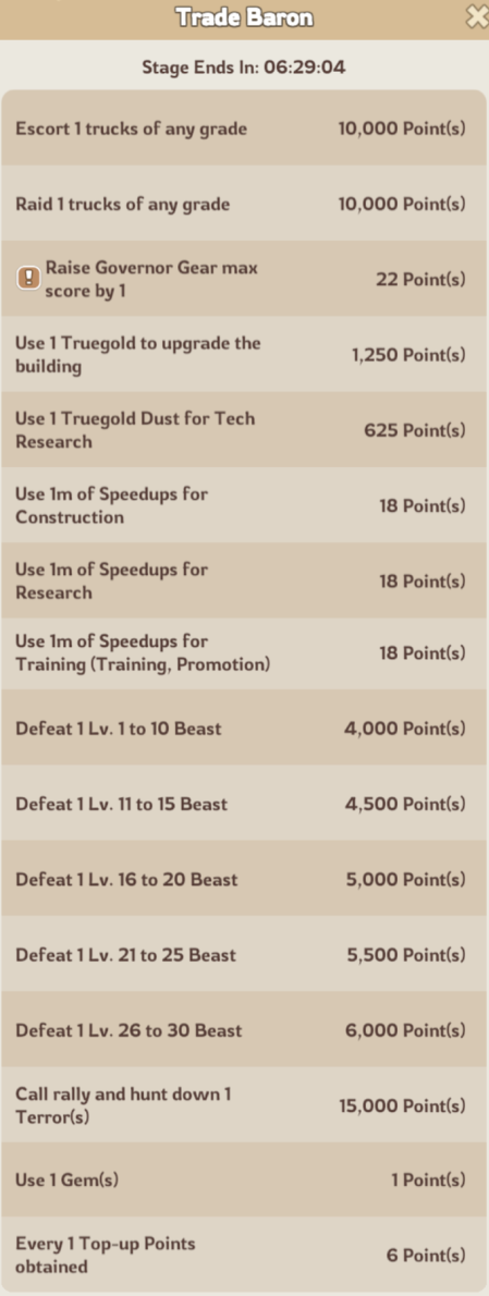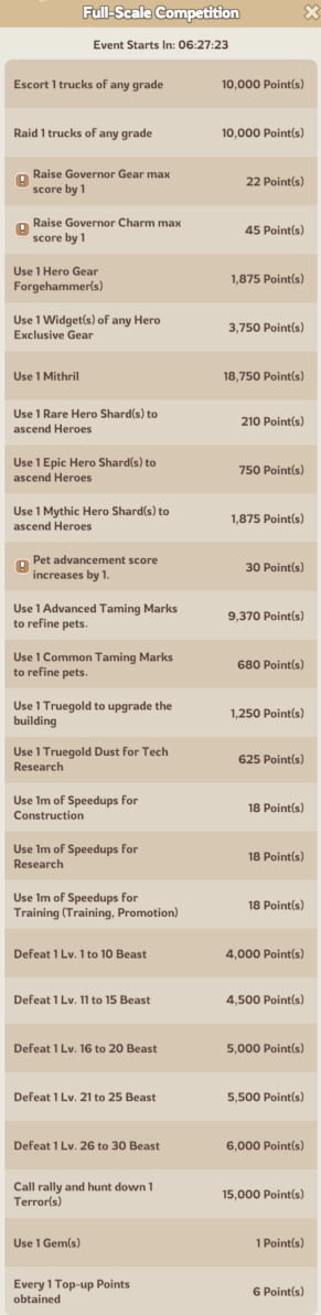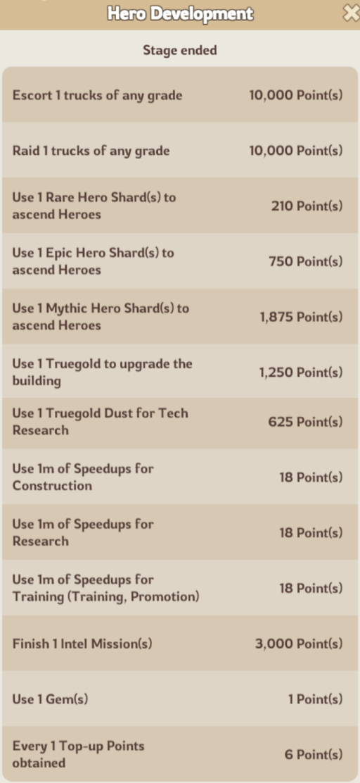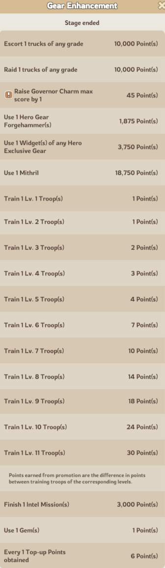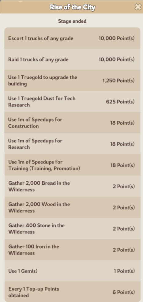 Completing tasks like escorting or raiding caravans, troop training, building upgrades, hero/gear improvements, spending gems, earning top up points or gathering resources/intels all contribute toward your total points.