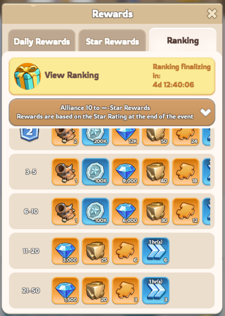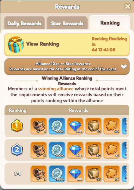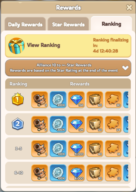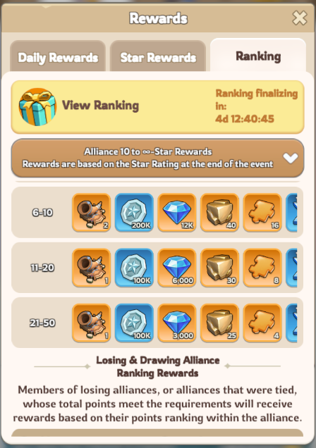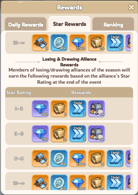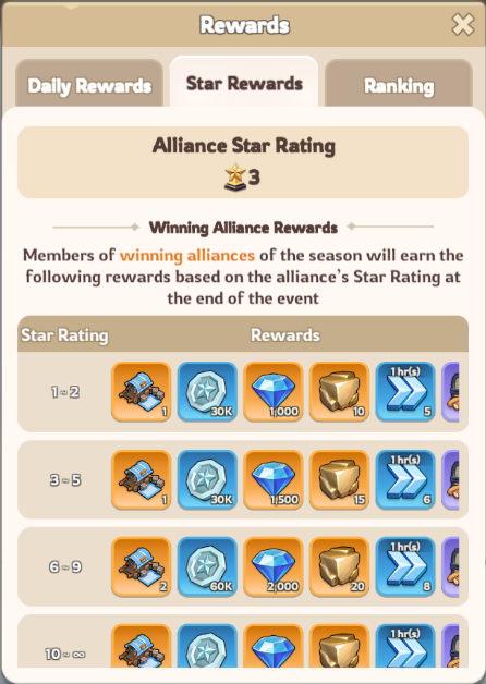 Performance rewards based on alliance ranking and Star Rating — winning improves the final rewards possible.