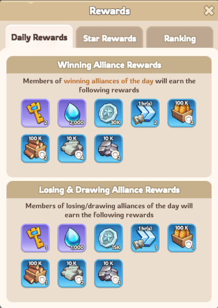 Alliance rewards based on daily performance — both sides receive rewards, but the winning alliance earns greater prizes.