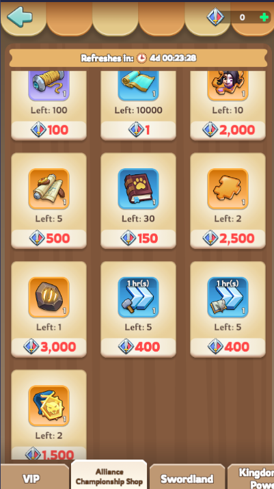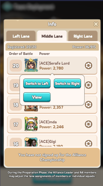 From Monday 00:00 UTC to Wednesday 23:00 UTC, all members in your alliance that are at least Town Center Level 10 may sign up a march for a lane. There are three lanes, each with a capacity of 20 players (for a total of 60). You will notice a score value after registring, this is your combat score, and your order of fighting within a lane depends on that score (largest score fights last). Note: Registration takes a “snapshot” of your current march and all related buffs. Therefore, if you for instance registered when your pets are active, even after the pets expire, the alliance championship registration will “remember” those pet buffs, but they would be lost if you “update” your team later.