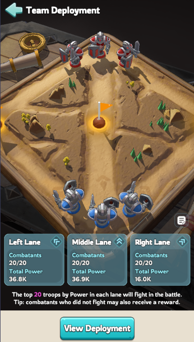Strategy Advice: To take the win for a round, you have to conquer either two or three lanes. Aiming for a 2-1 victory is your safest and best bet. A good strategy for this tactic would be to focus your firepower on two lanes, fitting your 40 strongest members in them and discarding “1 lane”. You risk earning less points from each round potentially affecting your final ranking if the enemy manages to sweep all 3 flags each round, but it is the best strategy considering a full sweep is rarely possible.