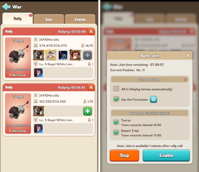 This mission can also be beaten not Only by starting a rally but also joining one (wolves don’t count unfortunately) this makes this a good mission to start when you are low on resources and stamina as you can manually enter rallies or throw auto join on and beat it for No cost. I put on auto join and log off since it will slowly complete on its own.