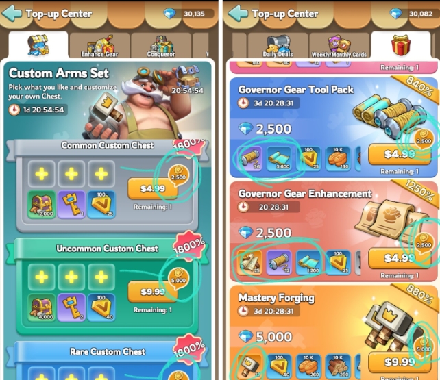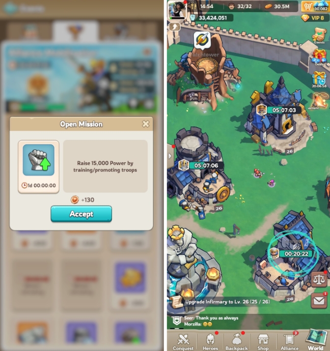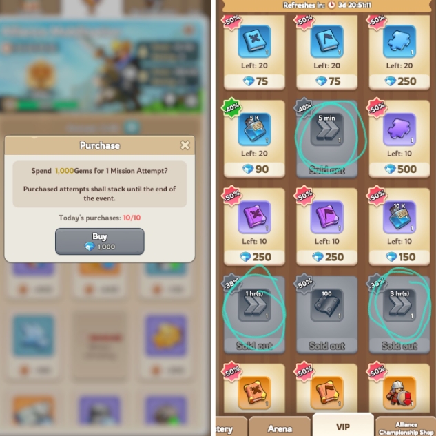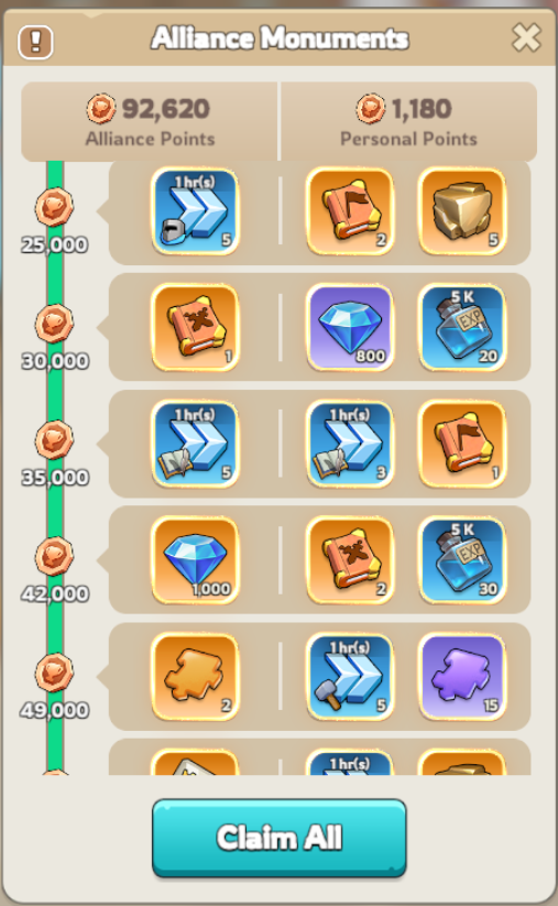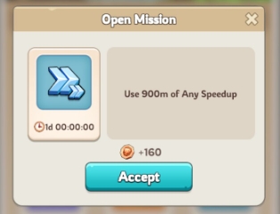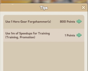 Try to line up your choices with other events going on as well for more loot for less spend. A good example is we have war preparation going currently. You get points for using forge hammers and training speed ups. Hit these AM missions when these events are active to be able to complete more then one task all together.