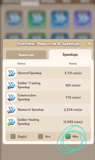 You can check your resources like speed up using the little chart in the right hand corner and changing the time to minutes.