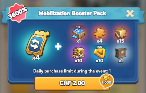 While the base rewards continue to differ based on alliance mobilization ranking, 2x Custom Mission Vouchers will always be found in the Alliance Monuments (dependent on Personal Points). Therefore, every AM event you can earn 2 free Custom Mission Vouchers, with the option of buying 4x Custom Mission Vouchers every day with a 1,000 Kingdom Coins Mobilization Booster Pack.