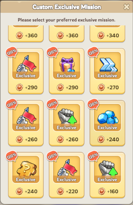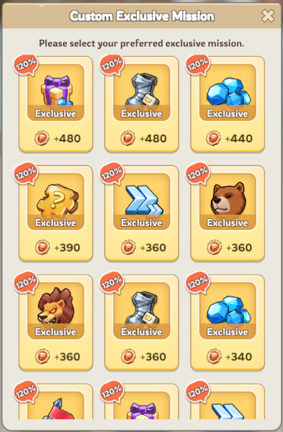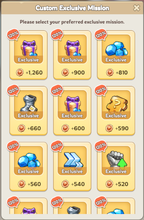 3x 120% exclusive mission, 1x 200% exclusive mission. The first Custom Mission Voucher you use will allow you to choose a 200% mission (granted that one has not been done/is not available). All other tickets will be 120% (up to 3 times). This allows greater flexibility with personal missions, and a less “chance” based AM event!