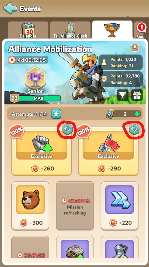 The whole alliance has missions we share for a set amount of points or you have two exclusive missions that only you can control. These exclusive missions can be refreshed as many times as you want for a cool down cost. These missions have a potential modifier from 120% to %200 extra points. These are the key to setting up what missions you need throughout the day and for getting extra points per attempt. You can only do 4 per day before you have to wait for reset.