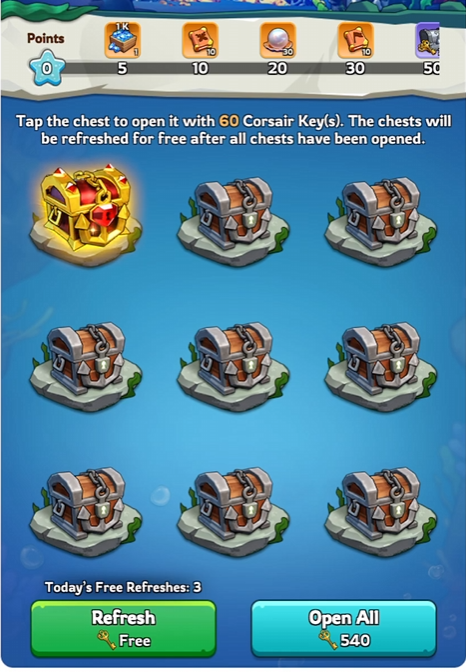 Open chests! Each individual chest, regardless of type requires 60 keys to open. You can refresh 3x a day for free, after which it will cost 90x corsair keys to refresh. Note: The daily refreshes do not stack, you will always start the day with max. 3 Refreshes, so use them while you can!