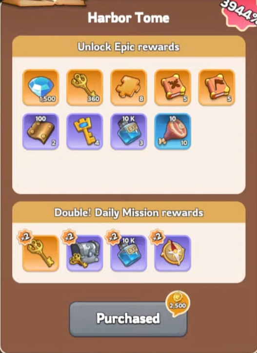 There are additional rewards from the milestones if you purchase the Harbor Tome pack (responsible for doubling the daily rewards)