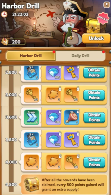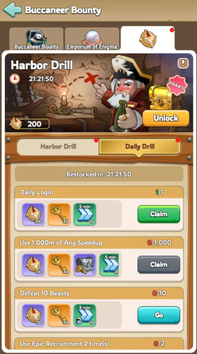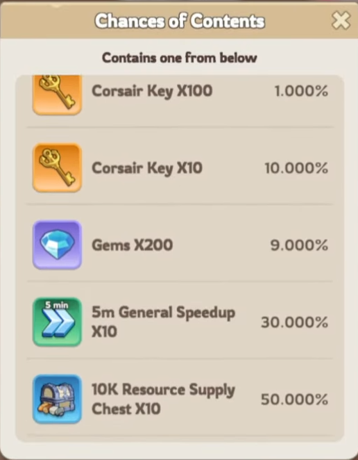 This part of the event is the source for Corsair Keys, a critical resource for this event. You can complete daily missions that unlocks Keys, as well as progress down a Milestone and unlock additional rewards/keys. Note: You can buy a [499 kingdom coins] pack that doubles your rewards from daily missions! Considering the rarity of widgets and skins, it is found to be a commonly purchased pack.