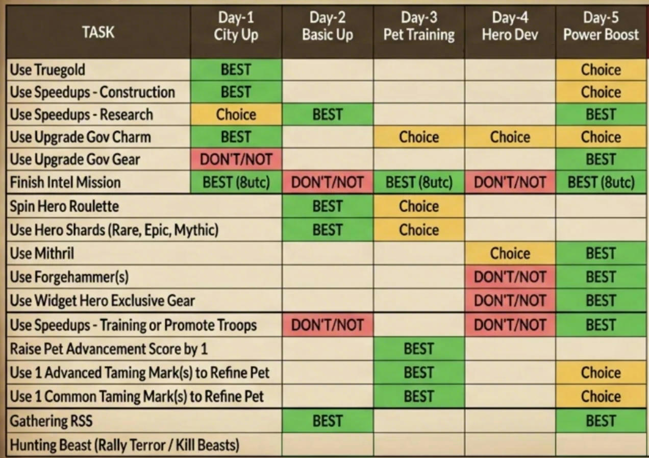 Day 4: Mobilize (Training speed) and have players apply for Noble Advisor. If the position is full, players with fewer items can use the Chief Minister role, which still provides a 10% training bonus.