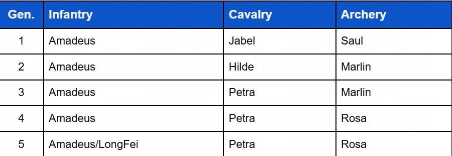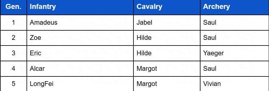 People seem to think that there is a difference between offense and defense, that defense should have more infantry, than 60/40/00 works all the time in defense, that defense should have defensive joiners like gordon… This is not true, defense and offense are exactly the same, kills get calculated simultaneously at the end of each mini round of a battle which means neither side has an advantage and would need to “tank more”. The only difference is the scenario in which the hero’s widget will activate. That’s why most top heroes of offense and defense are just the latest hero with a matching type of widget. 60 40 00 works very well with margot and alcar because their skills are particularly oriented toward cavalry and infantry, in gen 4 with this composition you give to 100% of your garrison the base statistic of gen 4 (instead of having archers with base statistic of gen 3 yaeger) and you take great hero’s skills from Saul.